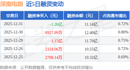 证券之星消息,12月31日,深南电路(002916)融资买入1.32亿元,融资偿还2.58亿元,融资净卖出1.26亿元,融资余额11.14亿元,近20个交易日中有11个交易日出现融资净买入。