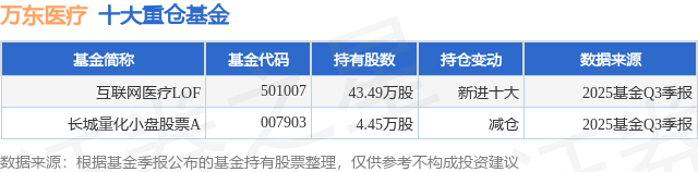 根据2025基金Q3季报公募基金重仓股数据,重仓该股的公募基金共2家,其中持有数量最多的公募基金为汇添富基金的互联网医疗LOF。互联网医疗LOF目前规模为0.7亿元,最新净值0.9335(12月31日),较上一交易日上涨0.16%,近一年上涨8.86%。该公募基金现任基金经理为吴振翔。吴振翔在任的基金产品包括:汇添富上证综合指数A,管理时间为2010年2月6日至今,期间收益率为89.94%;汇添富沪深300安中指数A,管理时间为2013年11月6日至今,期间收益率为201.29%;汇添富中证精准医疗指数(LOF)C,管理时间为2016年1月21日至今,期间收益率为-7.43%;汇添富中证上海国企ETF,管理时间为2016年7月28日至今,期间收益率为5.3%。
