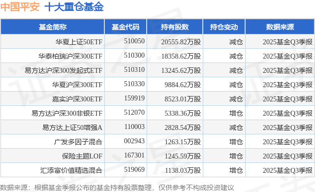 根据2025基金Q3季报公募基金重仓股数据,重仓该股的公募基金共649家,其中持有数量最多的公募基金为华夏基金的华夏上证50ETF。华夏上证50ETF目前规模为804.54亿元,最新净值3.1046(12月31日),较上一交易日下跌0.19%,近一年上涨16.35%。该公募基金现任基金经理为徐猛。徐猛在任的基金产品包括:华夏恒生ETF联接A,管理时间为2015年12月21日至今,期间收益率为45.9%;华夏恒生ETF(QDII),管理时间为2015年12月21日至今,期间收益率为50.12%;华夏上证50ETF联接A,管理时间为2016年12月1日至今,期间收益率为45.6%;