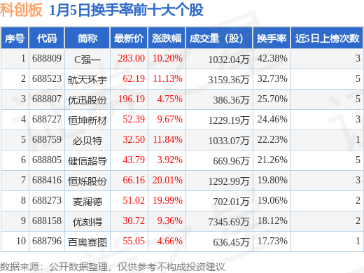 当日科创板换手率前10大个股全线收涨,平均涨幅10.55%,其中C强一(688809)以换手率42.38%排第一,8只个股近5个交易日中多次上榜。
