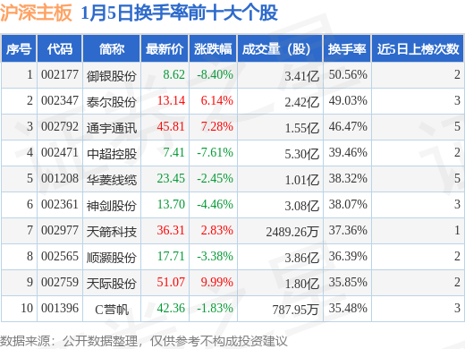 当日沪深主板换手率前10大个股中4只个股收涨,平均涨幅6.56%,其中御银股份(002177)以换手率50.56%排第一,9只个股近5个交易日中多次上榜。