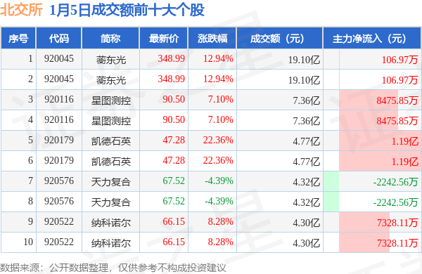 当日北交所成交额前10大个股中8只个股收涨,平均涨幅12.67%,其中蘅东光(920045)以成交额19.1亿元排第一。从主力资金流入看,成交额前10大个股中有8只个股呈现主力资金净流入。