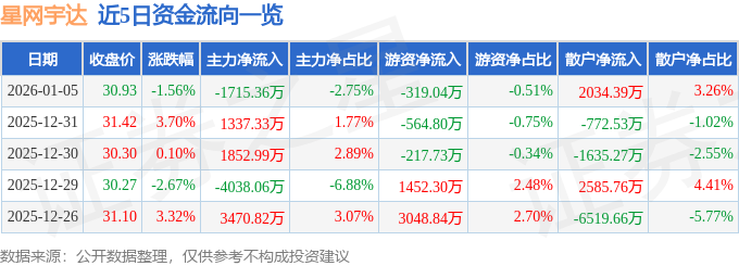 证券之星消息,截至2026年1月5日收盘,星网宇达(002829)报收于30.93元,下跌1.56%,换手率13.87%,成交量20.26万手,成交额6.24亿元。