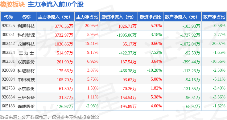 从资金流向上来看,当日橡胶板块主力资金净流出8472.1万元,游资资金净流出1562.1万元,散户资金净流入1.0亿元。橡胶板块个股资金流向见下表: