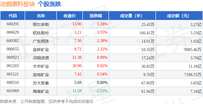 证券之星消息,1月5日冶钢原料板块较上一交易日上涨1.45%,鄂尔多斯领涨。当日上证指数报收于4023.42,上涨1.38%。深证成指报收于13828.63,上涨2.24%。冶钢原料板块个股涨跌见下表: