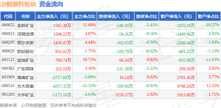 从资金流向上来看,当日冶钢原料板块主力资金净流出5701.11万元,游资资金净流入1369.19万元,散户资金净流入4331.92万元。冶钢原料板块个股资金流向见下表: