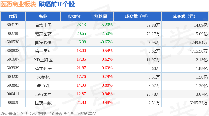 从资金流向上来看,当日医药商业板块主力资金净流入2.31亿元,游资资金净流出3.03亿元,散户资金净流入7188.12万元。医药商业板块个股资金流向见下表: