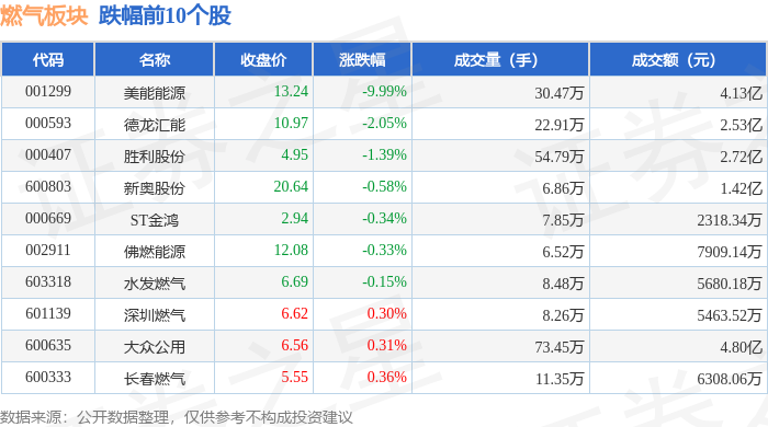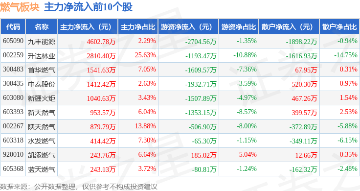 从资金流向上来看,当日燃气板块主力资金净流出6640.4万元,游资资金净流出4899.81万元,散户资金净流入1.15亿元。燃气板块个股资金流向见下表: