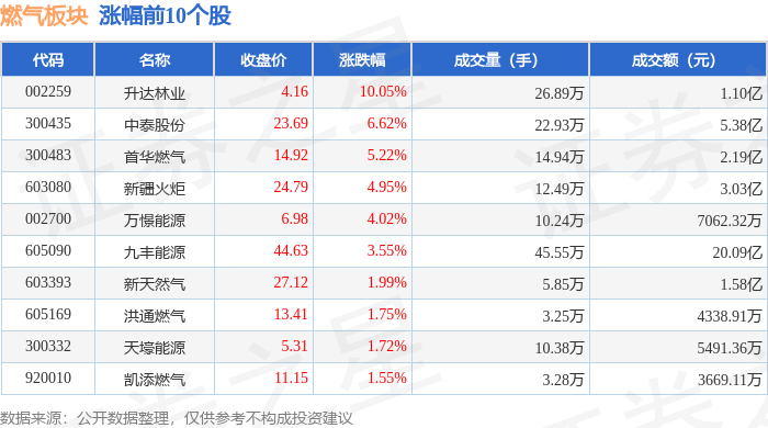 证券之星消息,1月5日燃气板块较上一交易日上涨0.94%,升达林业领涨。当日上证指数报收于4023.42,上涨1.38%。深证成指报收于13828.63,上涨2.24%。燃气板块个股涨跌见下表: