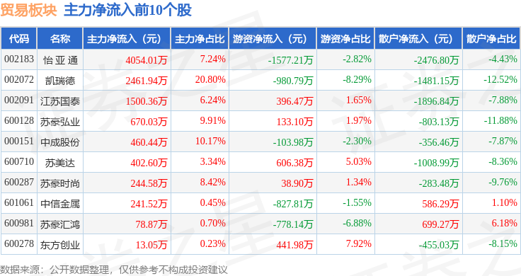 从资金流向上来看,当日贸易板块主力资金净流入7680.85万元,游资资金净流出2266.26万元,散户资金净流出5414.59万元。贸易板块个股资金流向见下表: