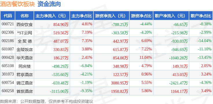 从资金流向上来看,当日酒店餐饮板块主力资金净流出2429.75万元,游资资金净流入6324.34万元,散户资金净流出3894.58万元。酒店餐饮板块个股资金流向见下表: