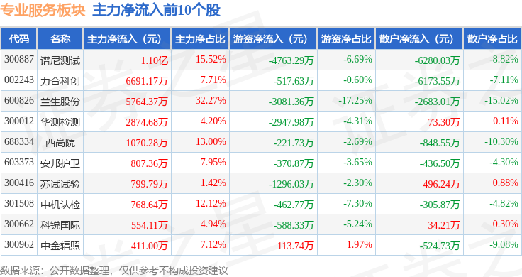 从资金流向上来看,当日专业服务板块主力资金净流入1.77亿元,游资资金净流出8122.3万元,散户资金净流出9578.2万元。专业服务板块个股资金流向见下表: