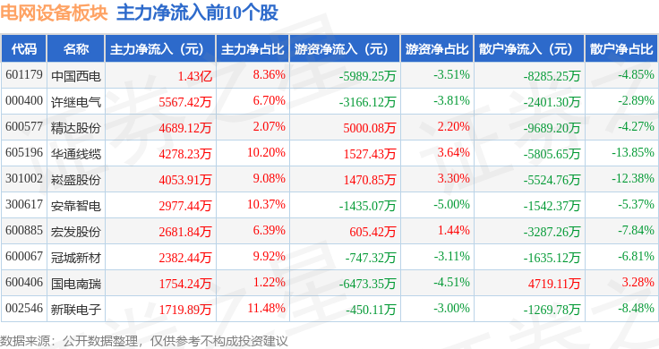从资金流向上来看,当日电网设备板块主力资金净流出13.14亿元,游资资金净流出3.21亿元,散户资金净流入16.35亿元。电网设备板块个股资金流向见下表: