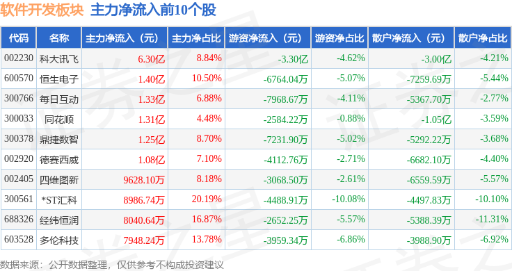 从资金流向上来看,当日软件开发板块主力资金净流入5.1亿元,游资资金净流出2.05亿元,散户资金净流出3.05亿元。软件开发板块个股资金流向见下表: