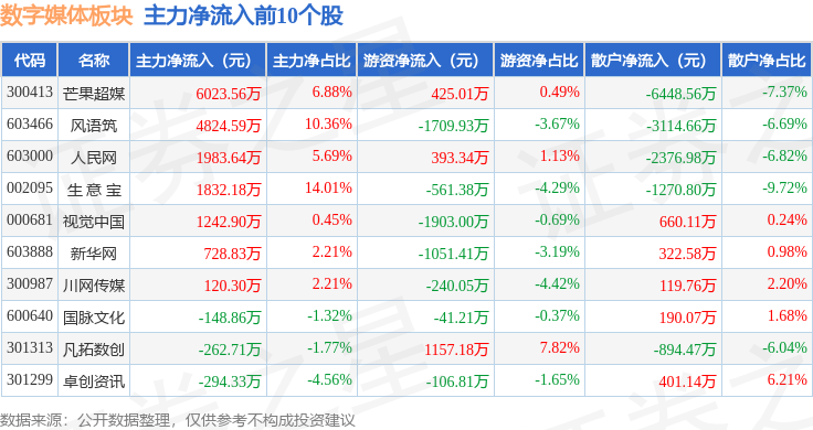 从资金流向上来看,当日数字媒体板块主力资金净流入5177.52万元,游资资金净流出4080.75万元,散户资金净流出1096.77万元。数字媒体板块个股资金流向见下表: