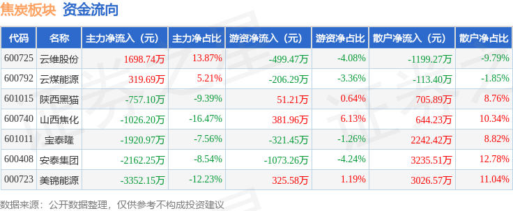 从资金流向上来看,当日焦炭板块主力资金净流出7200.24万元,游资资金净流出1341.72万元,散户资金净流入8541.96万元。焦炭板块个股资金流向见下表: