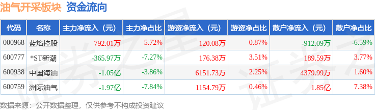 从资金流向上来看,当日油气开采板块主力资金净流出2.98亿元,游资资金净流入7602.98万元,散户资金净流入2.22亿元。油气开采板块个股资金流向见下表:
