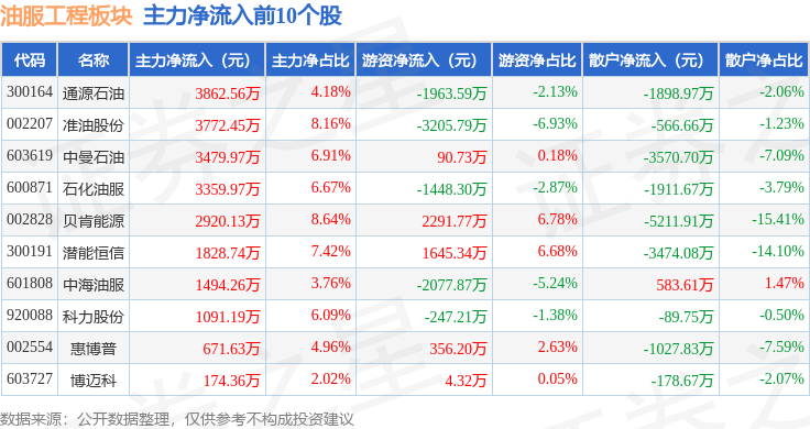 从资金流向上来看,当日油服工程板块主力资金净流入2.1亿元,游资资金净流出6366.12万元,散户资金净流出1.46亿元。油服工程板块个股资金流向见下表: