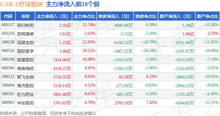 从资金流向上来看,当日CAR-T疗法板块主力资金净流入8.58亿元,游资资金净流出7.97亿元,散户资金净流出6135.51万元。CAR-T疗法板块个股资金流向见下表: