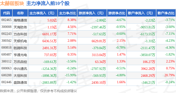 从资金流向上来看,当日太赫兹板块主力资金净流出26.99亿元,游资资金净流入10.61亿元,散户资金净流入16.37亿元。太赫兹板块个股资金流向见下表: