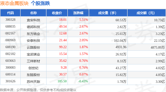 证券之星消息,1月5日液态金属板块较上一交易日上涨1.62%,宜安科技领涨。当日上证指数报收于4023.42,上涨1.38%。深证成指报收于13828.63,上涨2.24%。液态金属板块个股涨跌见下表: