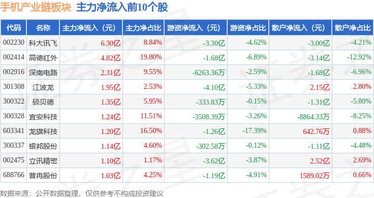 从资金流向上来看,当日手机产业链板块主力资金净流出3.3亿元,游资资金净流出21.63亿元,散户资金净流入24.93亿元。手机产业链板块个股资金流向见下表: