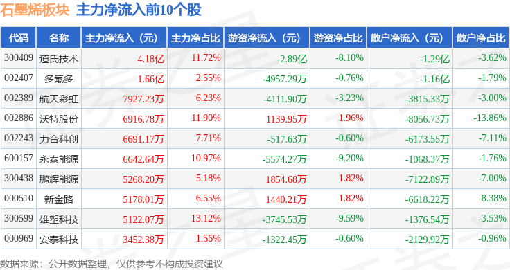 从资金流向上来看,当日石墨烯板块主力资金净流出8852.22万元,游资资金净流出5.66亿元,散户资金净流入6.54亿元。石墨烯板块个股资金流向见下表: