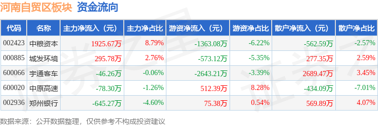 从资金流向上来看,当日河南自贸区板块主力资金净流入1451.61万元,游资资金净流出3991.64万元,散户资金净流入2540.03万元。河南自贸区板块个股资金流向见下表: