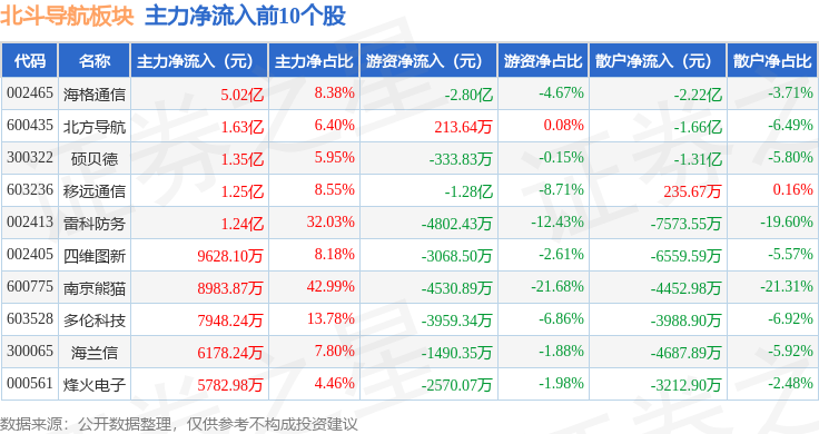 从资金流向上来看,当日北斗导航板块主力资金净流出53.87亿元,游资资金净流入19.91亿元,散户资金净流入33.96亿元。北斗导航板块个股资金流向见下表: