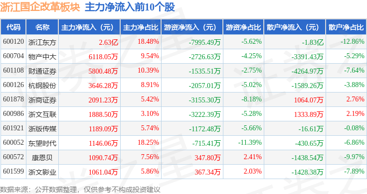 从资金流向上来看,当日浙江国企改革板块主力资金净流入1.25亿元,游资资金净流出3.44亿元,散户资金净流入2.2亿元。浙江国企改革板块个股资金流向见下表: