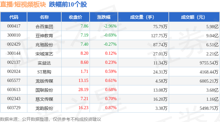 从资金流向上来看,当日直播/短视频板块主力资金净流出2.71亿元,游资资金净流出3.97亿元,散户资金净流入6.68亿元。直播/短视频板块个股资金流向见下表: