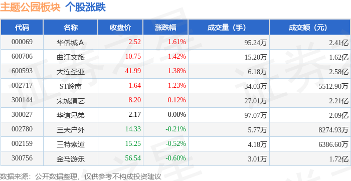 证券之星消息,1月5日主题公园板块较上一交易日上涨0.6%,华侨城A领涨。当日上证指数报收于4023.42,上涨1.38%。深证成指报收于13828.63,上涨2.24%。主题公园板块个股涨跌见下表: