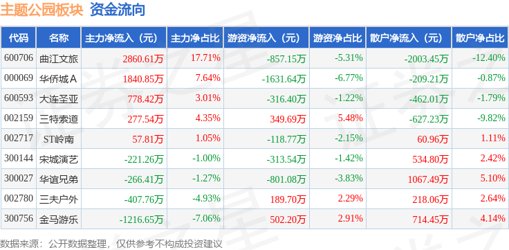 从资金流向上来看,当日主题公园板块主力资金净流入3703.14万元,游资资金净流出2997.0万元,散户资金净流出706.14万元。主题公园板块个股资金流向见下表: