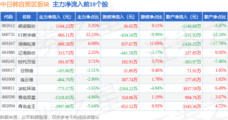 从资金流向上来看,当日中日韩自贸区板块主力资金净流出6.48亿元,游资资金净流入4.29亿元,散户资金净流入2.19亿元。中日韩自贸区板块个股资金流向见下表: