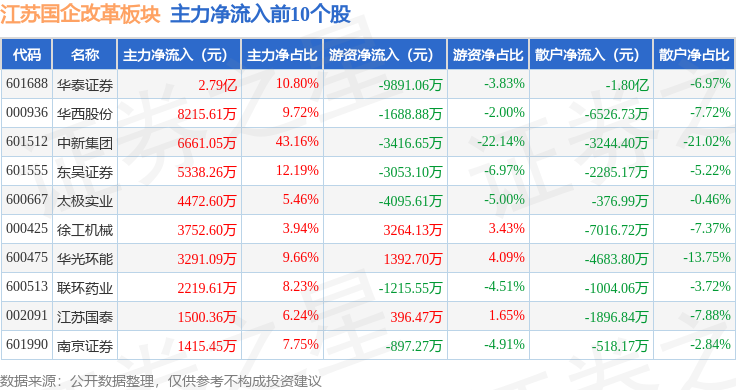 从资金流向上来看,当日江苏国企改革板块主力资金净流入3.9亿元,游资资金净流出1.1亿元,散户资金净流出2.8亿元。江苏国企改革板块个股资金流向见下表: