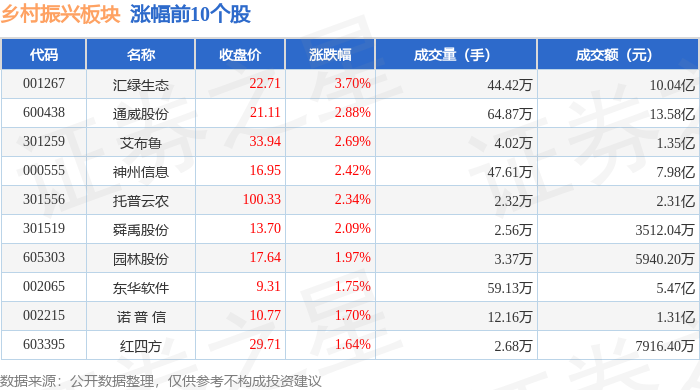 证券之星消息,1月5日乡村振兴板块较上一交易日上涨0.84%,汇绿生态领涨。当日上证指数报收于4023.42,上涨1.38%。深证成指报收于13828.63,上涨2.24%。乡村振兴板块个股涨跌见下表: