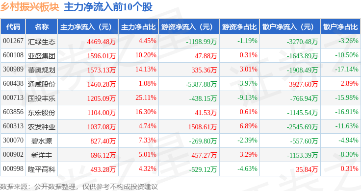 从资金流向上来看,当日乡村振兴板块主力资金净流出2.13亿元,游资资金净流入9475.27万元,散户资金净流入1.18亿元。乡村振兴板块个股资金流向见下表: