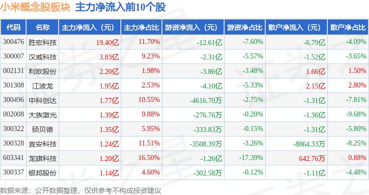 从资金流向上来看,当日小米概念股板块主力资金净流入11.11亿元,游资资金净流出39.88亿元,散户资金净流入28.77亿元。小米概念股板块个股资金流向见下表: