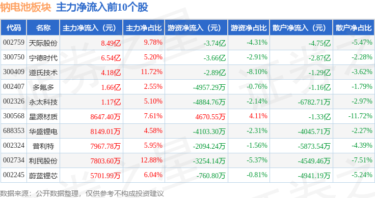 从资金流向上来看,当日钠电池板块主力资金净流入18.54亿元,游资资金净流出14.23亿元,散户资金净流出4.31亿元。钠电池板块个股资金流向见下表: