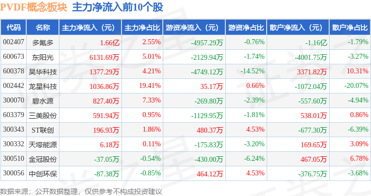 从资金流向上来看,当日PVDF概念板块主力资金净流出335.29万元,游资资金净流出2.08亿元,散户资金净流入2.11亿元。PVDF概念板块个股资金流向见下表: