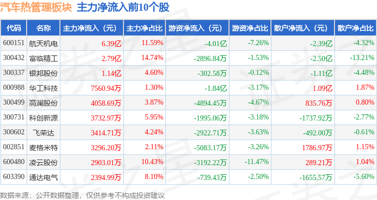 从资金流向上来看,当日汽车热管理板块主力资金净流出4.78亿元,游资资金净流出7.07亿元,散户资金净流入11.85亿元。汽车热管理板块个股资金流向见下表: