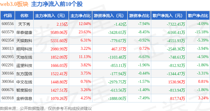 从资金流向上来看,当日web3.0板块主力资金净流出14.03亿元,游资资金净流入1.43亿元,散户资金净流入12.6亿元。web3.0板块个股资金流向见下表: