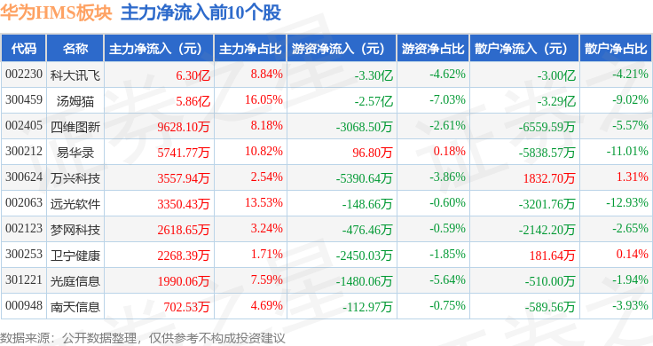 从资金流向上来看,当日华为HMS板块主力资金净流入8.27亿元,游资资金净流出2.97亿元,散户资金净流出5.3亿元。华为HMS板块个股资金流向见下表:
