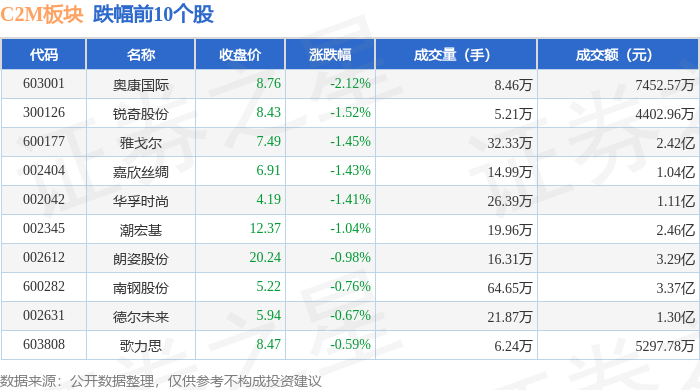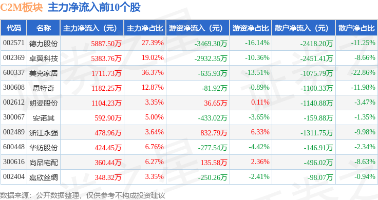 从资金流向上来看,当日C2M板块主力资金净流出4.23亿元,游资资金净流出3622.26万元,散户资金净流入4.59亿元。C2M板块个股资金流向见下表: