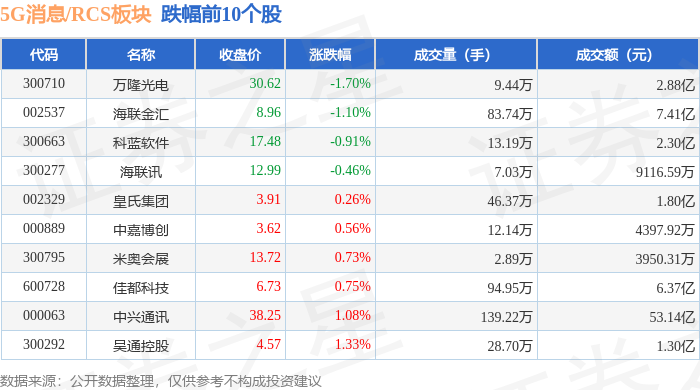 证券之星消息,1月5日5G消息/RCS板块较上一交易日上涨4.83%,蓝色光标领涨。当日上证指数报收于4023.42,上涨1.38%。深证成指报收于13828.63,上涨2.24%。5G消息/RCS板块个股涨跌见下表: