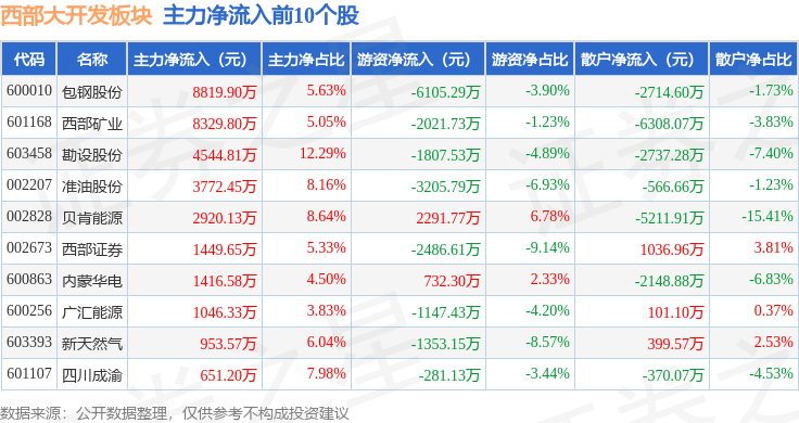 从资金流向上来看,当日西部大开发板块主力资金净流出3.0亿元,游资资金净流出1842.98万元,散户资金净流入3.18亿元。西部大开发板块个股资金流向见下表:
