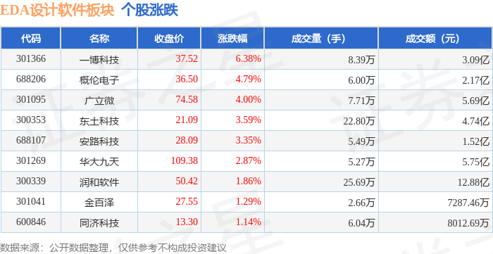 证券之星消息,1月5日EDA设计软件板块较上一交易日上涨2.06%,一博科技领涨。当日上证指数报收于4023.42,上涨1.38%。深证成指报收于13828.63,上涨2.24%。EDA设计软件板块个股涨跌见下表: