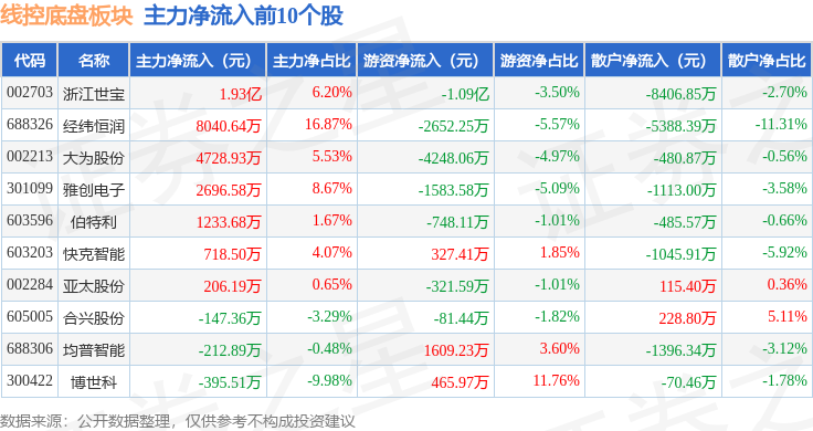 从资金流向上来看,当日线控底盘板块主力资金净流入2.23亿元,游资资金净流出1.63亿元,散户资金净流出5968.7万元。线控底盘板块个股资金流向见下表: