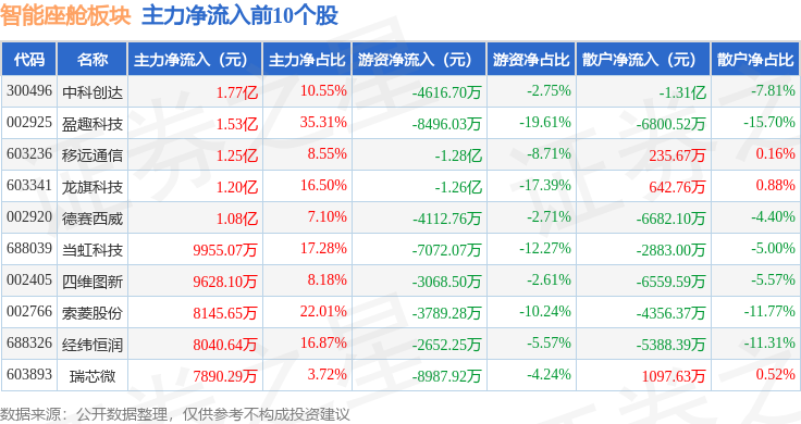 从资金流向上来看,当日智能座舱板块主力资金净流出1.05亿元,游资资金净流出8.86亿元,散户资金净流入9.91亿元。智能座舱板块个股资金流向见下表:
