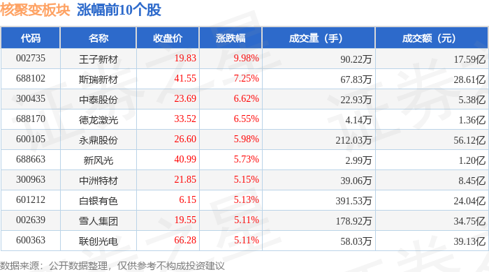 证券之星消息,1月5日核聚变板块较上一交易日上涨1.92%,王子新材领涨。当日上证指数报收于4023.42,上涨1.38%。深证成指报收于13828.63,上涨2.24%。核聚变板块个股涨跌见下表: